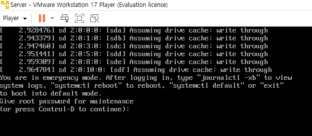 하드 디스크들을 제거한 다음 부팅을 하면 응급 복구 모드로 접속하게 된다. root 사용자의 비밀번호를 입력해서 root 프롬프트로 들어간다.