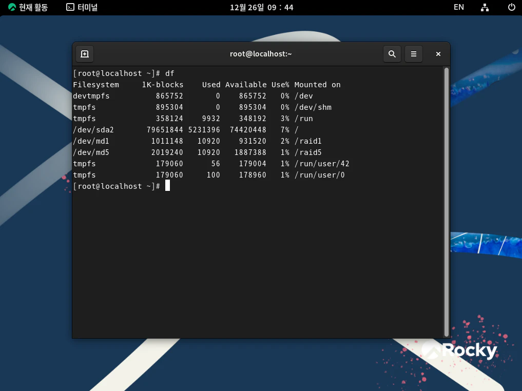터미널에서 df 명령을 입력한 다음 정상적으로 RAID들이 마운트되어있는지 확인한다.