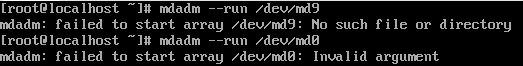 결함 허용을 제공하지 않는 RAID 장치를 가동해보자. mdadm --run /dev/md9와 mdadm --run /dev/md0 명령을 입력해 Linear RAID와 RAID 0를 가동하면 에러가 발생한다.