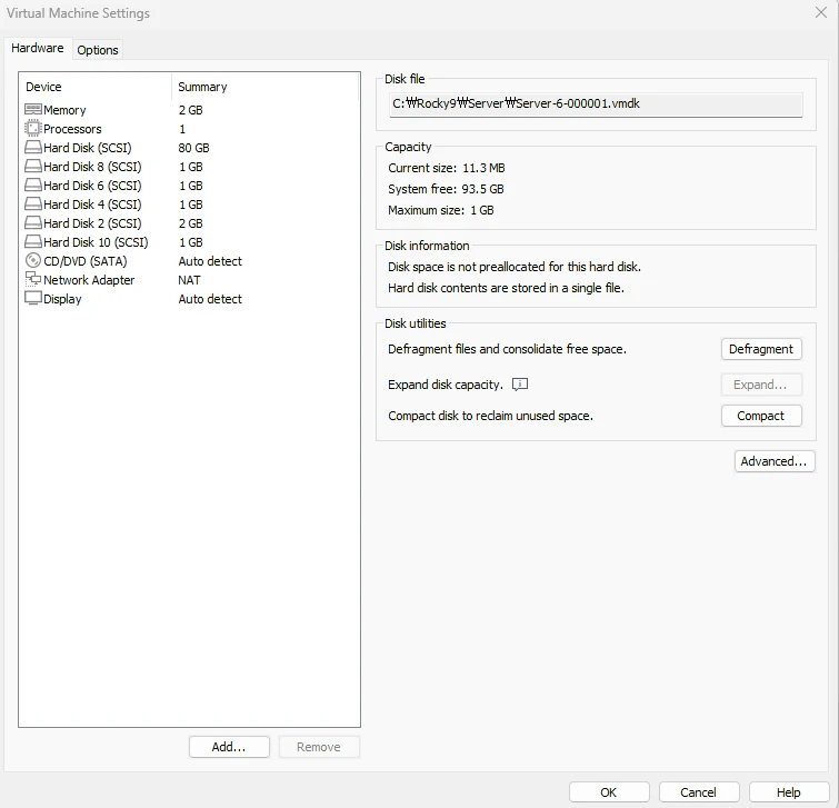 제일 위 그림에 맞게 하드 디스크를 제거를 해보자. SCSI 0:2, 0:4, 0:6, 0:9 를 제거한다. 혹시 모르니 Hard Disk 숫자만 보지말고 Advance를 눌러서 해당 SCSI가 맞는지 확인하는 것을 추천한다.