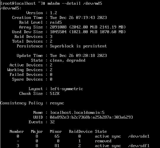 RAID 5도 3개의 장치로 만들었는데 현재 2개의 장치(/dev/sde1, /dev/sdf1)만 동작하고 있다.