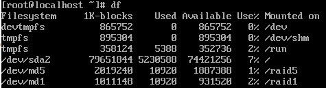재부팅을 하면 정상적으로 접속을 할 수 있다. root 사용자로 접속한 다음 df 명령을 실행하면 결함 허용 기능이 있는 RAID1과 RAID5 는 생존해 있고, 결함 허용 기능이 없는 Linear RAID와 RAID 0는 가동조차 하지않는다.