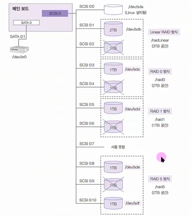 - Linear RAID, RAID 0, 1, 5의 하드디스크가 고장난 상황을 본다.