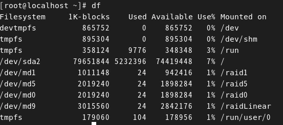 df 명령을 통해 살펴보면 RAID 1과 RAID 5는 결합 허용 기능 덕분에 디스크가 날아가도 생존해 있다. 결합 허용 기능이 없는 LinearRAID와 RAID 0는 보이지 않는다.