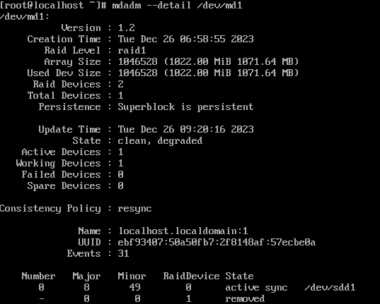 mdadm --detail /dev/md1 명령을 입력해 RAID 1을 살펴보자.