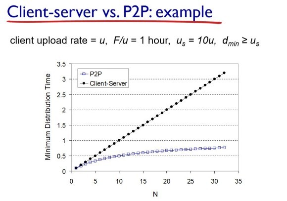 클라이언트-서버 방식은 사용자가 증가할수록 파일의 업로드/다운로드 시간이 선형적으로 증가하는데 반해, P2P 방식은 로그 함수로 증가한다.