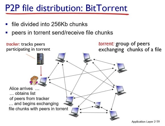 예를 들어, 앨리스가 어떤 파일을 얻고 싶으면 먼저 트랙커에게 접속해서 나 이런 파일을 가지고 싶어요 라고 요청하면 트랙커가 해당 파일을 가지고 있는 피어 명단을 리턴해준다. 그러면 앨리스는 그 리스트를 기반으로 가장 좋은 피어들을 뽑아서 파일을 받는다.